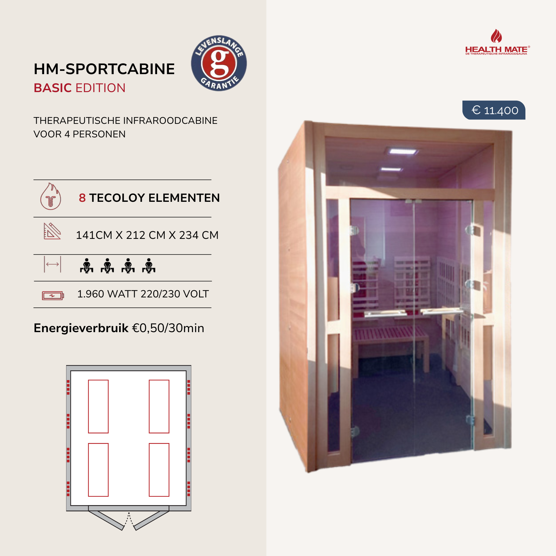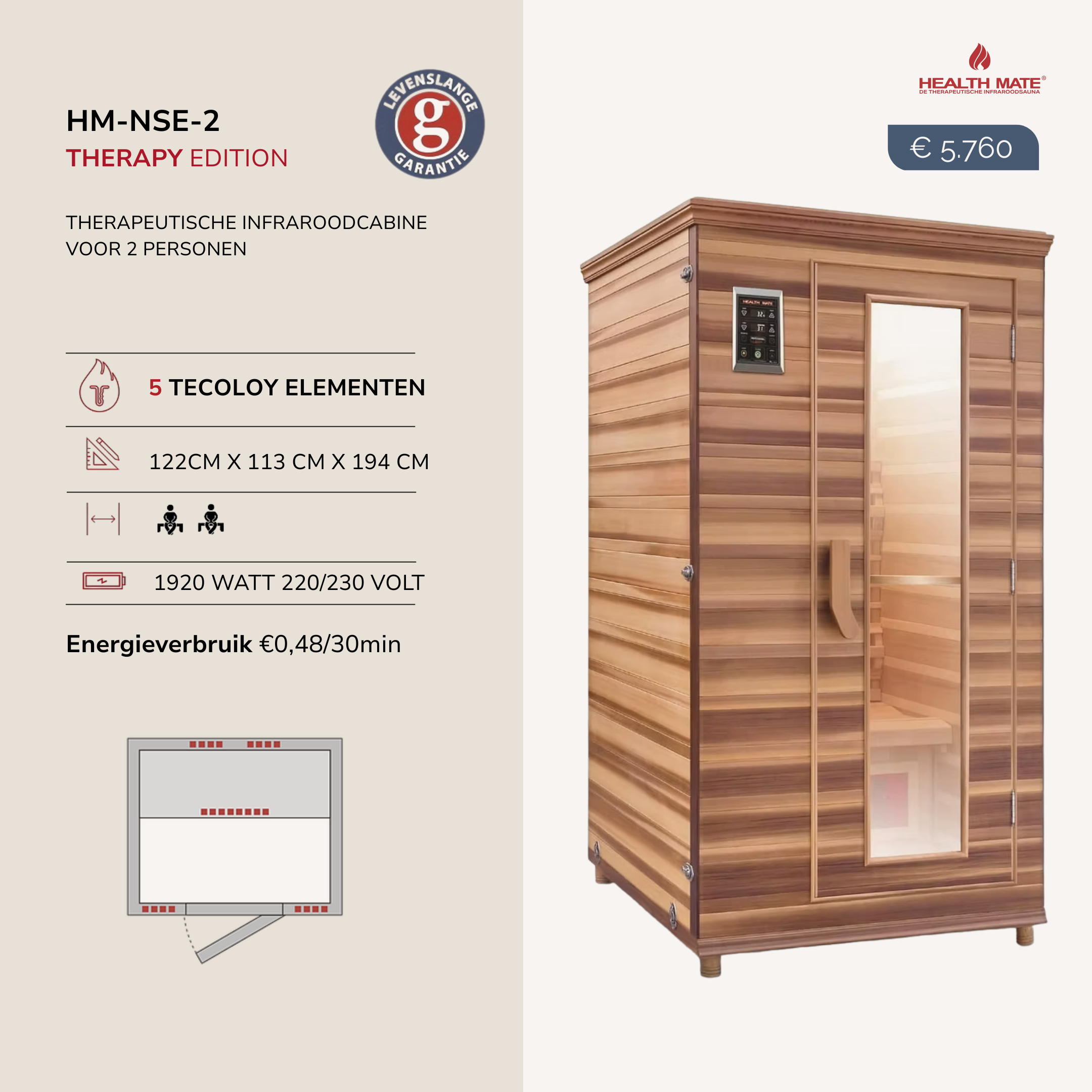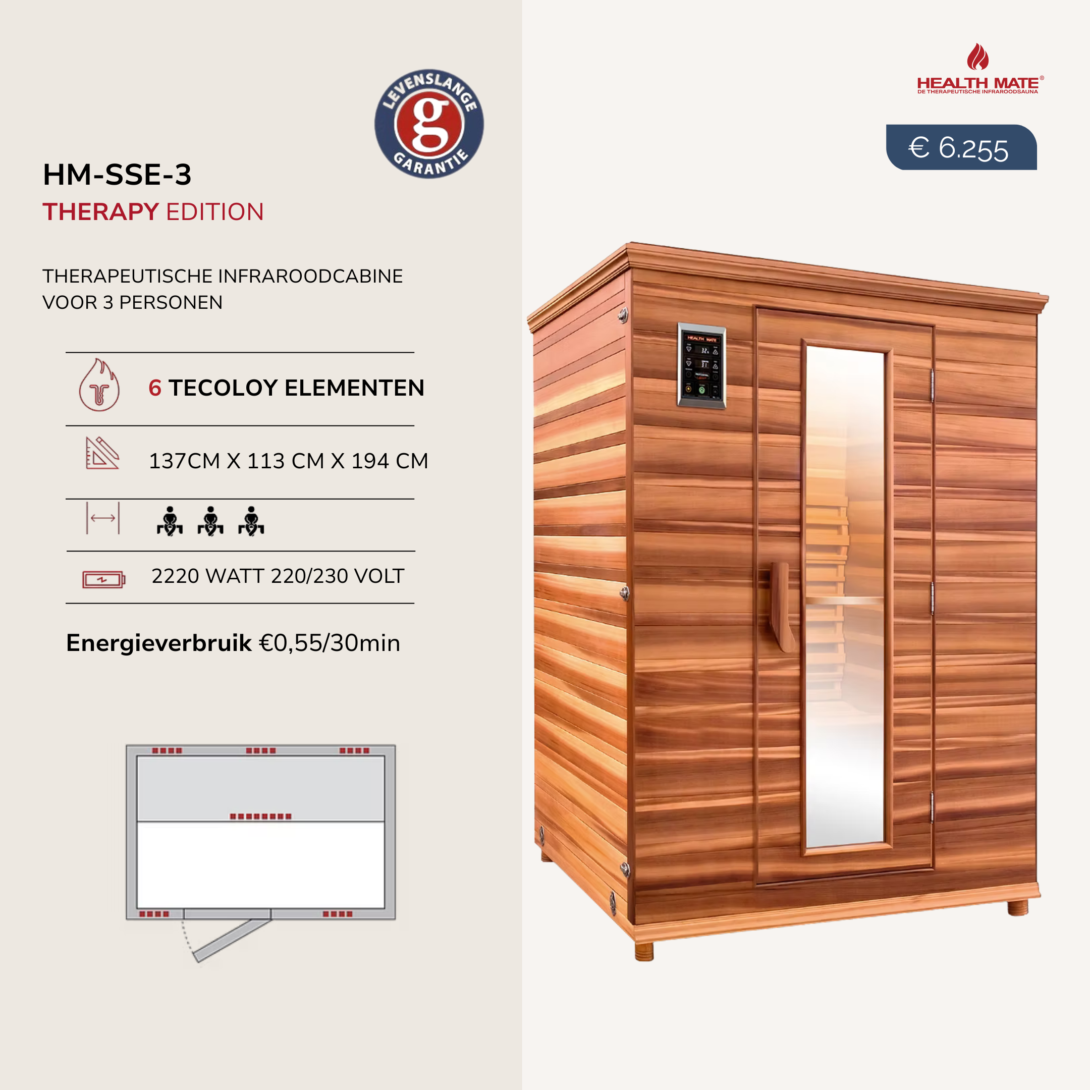 Een basis infraroodsauna met therapeutisch effect en Tecoloy-langegolfstralers (= op 6340 nm), zonder led-kleurentherapie, vloerverwarming, lage rugstralers en Bluetooth systeem.